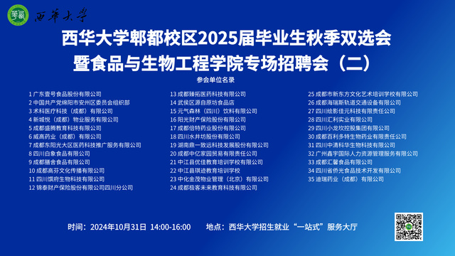 西华大学郫都校区2025届毕业生秋季双选会暨bv伟德国际体育官方网站专场招聘会,将于2024年10月31日14:00-16:00,在西华大学招生就业“一站式”服务大厅举行,欢迎同学们前来参加!