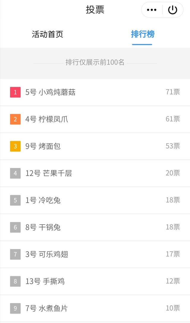 本次活动以“我与**(美食)”为主题,以文字、图文或视频,以及都相结合的方式提交作品。完成作品收集后,由公关部成员内部筛选。过后,公关部将作品放到网络上面由大家评选,选出一、二、三等奖。其中,一等奖一名,二等奖三名,三等奖五名。活动共二十六名参赛人员,二十九个作品。作品内容丰富多彩,有视频、图文、文件等多种格式。经过公开投票,五号作品《小鸡炖蘑菇》以七十一票拔得头筹,荣获一等奖。四号作品《柠檬凤爪》六十一票、九号作品《烤面包》五十三票、十二号作品《芒果千层》二十票紧随其后,均获二等奖。《冷吃兔》十八票、《干锅兔》十八票、《可乐鸡翅》十七票、《手撕鸡》十二票、《水煮鱼片》十票获三等奖。