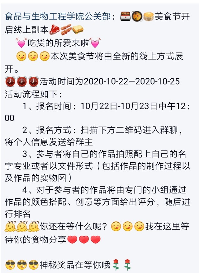 2020年10月21日,bv伟德国际体育官方网站线上美食节活动正式开始。本次活动由bv伟德国际体育官方网站主办,bv伟德国际体育官方网站公关部承办。本次活动面向bv伟德国际体育官方网站全体同学开展。