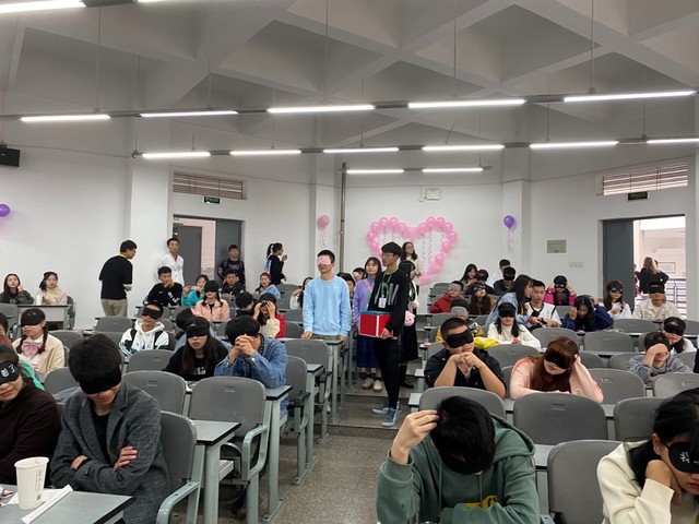 活动在各位同学的陆续到齐中拉开帷幕。首先是由到场的女同学在明信片上写下自己的兴趣爱好或者自己感兴趣的话题,之后会由工作人员收好后将其挂在男同学所待的教室的墙上,由男同学凭第一印象进行自由选择。选择完毕后将在工作人员的指挥下进行男同学的眼罩佩戴。佩戴好后按照编号进行排队进入女同学所在教室进行配对,由工作人员在保证安全的前提下安排男女同学坐在一起展开首次交流。经过一番交流之后,男女同学均可举手示意工作人员摘下眼罩或者自行离开,继续选择留下来的同学可选择参与到下一轮的游戏环节。游戏环节中若抢到答题机会并且回答正确者可以获得一次抽奖机会。奖品包括自嗨锅,电影票,由‘提拉米苏’赞助的纸杯蛋糕,由花芝烧仙草赞助的奶茶,暖宝宝以及各种小礼品。参与活动的每位嘉宾均可获得答题机会。参与的男女同学反响都很好,在欢声笑语中结识了新朋友。