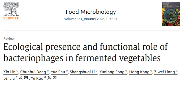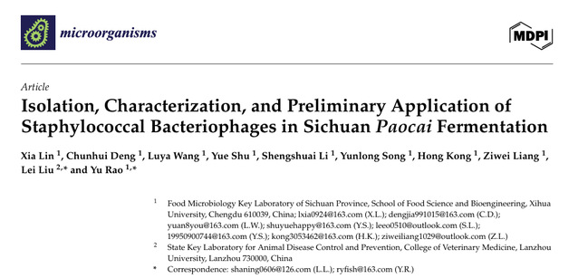 近日,bv伟德国际体育官方网站“农产品贮藏与加工”团队饶瑜教授等人在国际食品顶级期刊《Food Microbiology》(Q1,IF:4.6)发表题为“Ecological presence and functional role of bacteriophages in fermented vegetables”的综述论文。在国际微生物学领域权威期刊《Microorganisms》(Q2,IF:4.2)发表题目为“Isolation, Characterization, and Preliminary Application of Staphylococcal Bacteriophages in Sichuan Paocai Fermentation”的论文。西华大学硕士研究生林霞为论文第一作者,西华大学饶瑜教授和兰州大学刘蕾青年研究员为论文共同通讯作者,西华大学为第一完成单位。