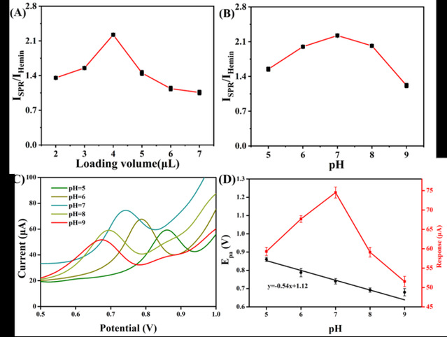 图5 修饰体积、pH条件优化及峰电位与pH的线性关系
