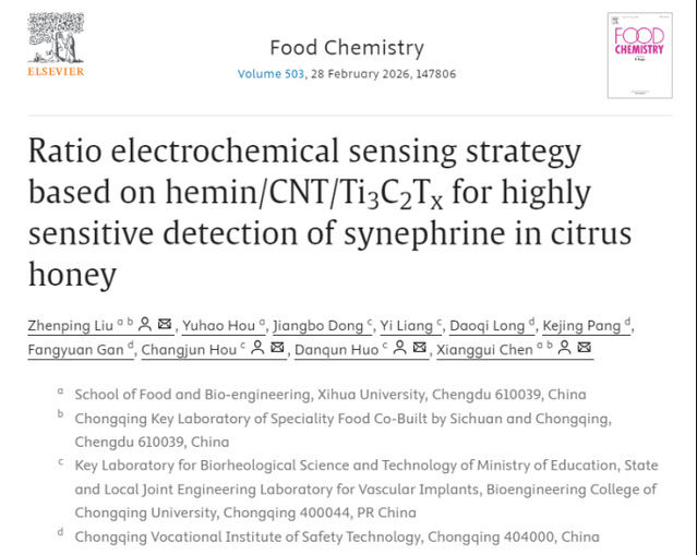 近日,西华大学bv伟德国际体育官方网站食品营养与安全团队在《Food Chemistry》(中科院一区TOP,IF: 9.8)发表题为“Ratio electrochemical sensing strategy based on hemin/CNT/Ti3C2Txfor highly sensitive detection of synephrine in citrus honey”的研究性论文。西华大学bv伟德国际体育官方网站刘振平教授为第一作者,通讯作者为重庆大学侯长军教授、霍丹群教授和西华大学bv伟德国际体育官方网站陈祥贵教授。