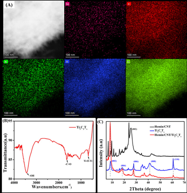 图2 EDS元素映射、FT-IR和XRD图,确认材料成分及结