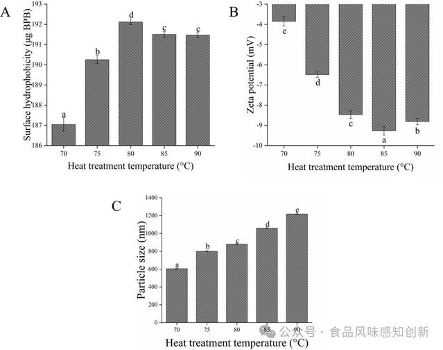 图1 不同热处理温度猪肉MPs表面疏水性(A)、zeta电位(B)和粒径分布(C)变化。不同字母表示在不同热处理温度下存在显著差异(Duncan检验,p<0.05)。