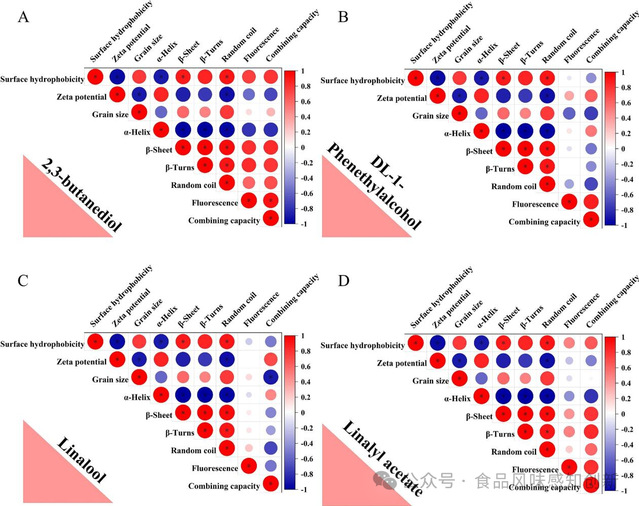 图4 猪肉MPs的空间构象参数及其对2,3-丁二醇(A)、DL-1-苯乙醇(B)、芳樟醇(C)和乙酸芳樟酯(D)结合能力的相关性分析热图。符号(*)表示0.05水平的显著相关性。
