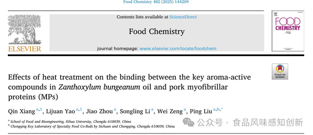 西华大学bv伟德国际体育官方网站向琴老师在《Food Chemistry》上发表题为“Effects of heat treatment on the binding between the key aroma-active compounds in Zanthoxylum bungeanum oil and pork myofibrillar proteins (MPs).”的研究性论文。西华大学bv伟德国际体育官方网站向琴老师和研究生姚丽娟同为第一作者,通讯作者为西华大学bv伟德国际体育官方网站刘平教授。该研究得到了重庆市科学技术委员会资助(cstc2021jscxcylhX0014)