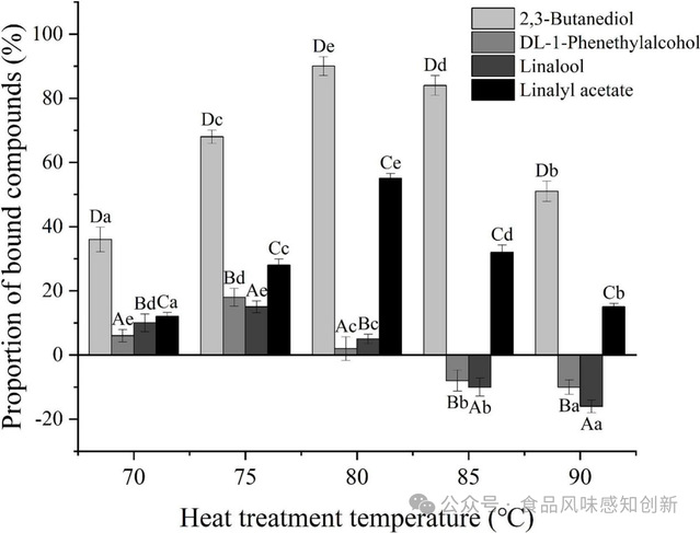 (3)加热温度对MPs与香气活性化合物的结合具有显著影响。2,3-丁二醇和芳樟醇乙酸酯更容易与MPs结合,而加热温度在80℃时会提高香气活性化合物的结合量。