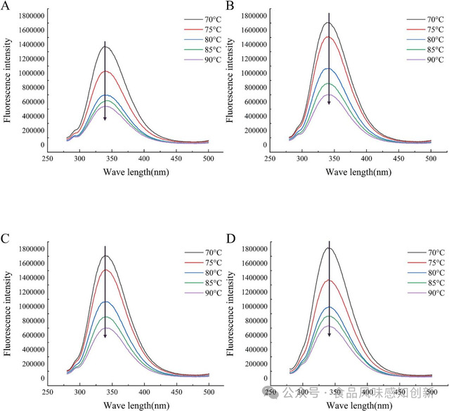 图2 热处理温度对1mg/mLMPs荧光强度的影响:2,3-丁二醇(A)、DL-1-苯乙醇(B)、芳樟醇(C)和乙酸芳樟酯(D)。