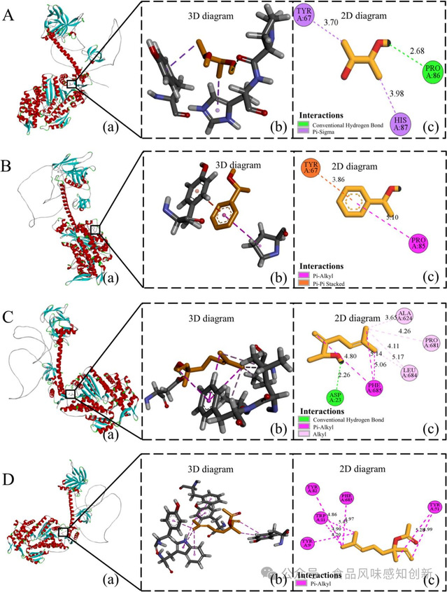 图5 猪肉MPs与花椒油芳香活性化合物相互作用的3D图,包括2,3-丁二醇(A)、DL-1-苯乙醇(B)、芳樟醇(C)和乙酸芳樟酯(D)。图a、b和c分别表示他们的最佳模型、最佳3D图和最佳2D图。