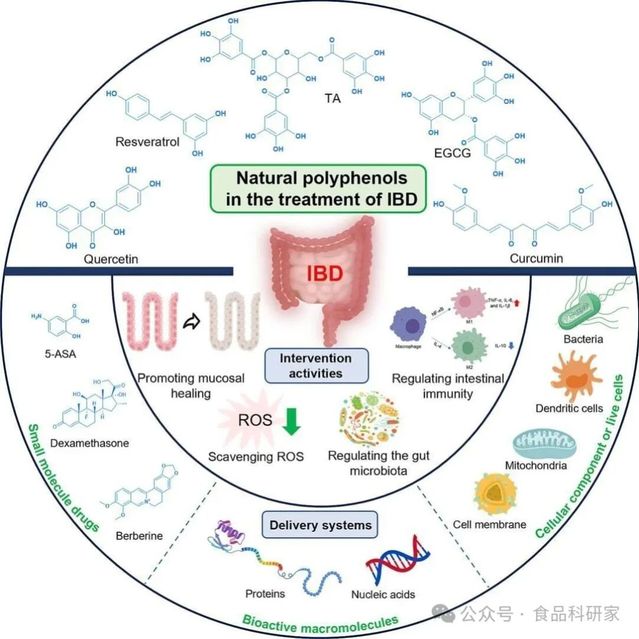天然多酚凭借优异的抗氧化、抗炎及免疫调节生物活性,在 IBD 治疗研究中取得了显著进展,展现出双重应用潜力:既可以作为治疗药物缓解 IBD 的病理变化,也可作为构建递送系统的重要材料。本综述全面总结了多酚干预 IBD 进展的四大机制,包括促进伤口愈合、发挥抗氧化作用、调节肠道菌群及调控肠道免疫。此外,系统梳理了各类多酚介导的药物递送系统在 IBD 治疗中的显著潜力,这些系统能够递送多种治疗剂,涵盖人工小分子药物、天然来源化合物、生物活性蛋白、核酸类治疗剂以及细胞成分与活细胞,凸显了多酚基平台在应对 IBD 复杂病理生理机制中的广泛适用性。