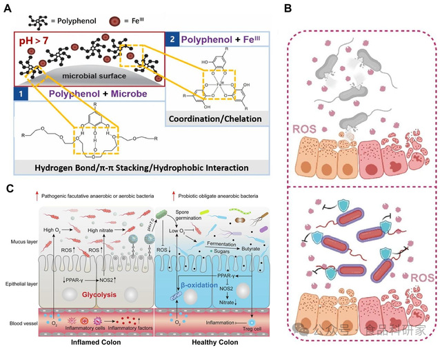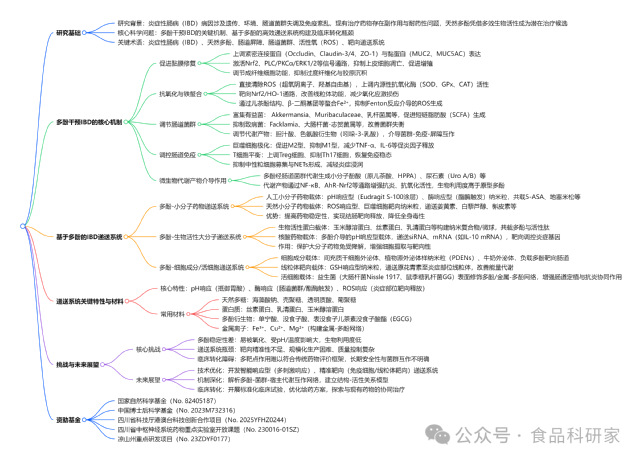 炎症性肠病(IBD)是一类以肠道慢性炎症为主要特征的胃肠道疾病,主要包括克罗恩病(CD)和溃疡性结肠炎(UC),其发病与肠道屏障损伤、肠道菌群失衡、免疫过度激活及环境因素密切相关,患者常表现为持续腹泻、腹痛、组织损伤等症状,严重影响生活质量。全球 IBD 发病率持续上升,预计 2030 年中国患者人数将接近 120 万,已成为重要的公共卫生挑战。目前临床常用治疗药物如 5 - 氨基水杨酸、糖皮质激素、免疫抑制剂等,长期使用易引发肝毒性、免疫功能受损、耐药性等问题,亟需开发安全高效的新型治疗策略。天然多酚广泛存在于植物中,具有结构多样性和多靶点药理活性,不仅能通过清除活性氧、修复肠道屏障、调节菌群平衡及免疫稳态发挥抗炎作用,其分子结构中的酚羟基还可通过氢键、疏水作用等与生物分子相互作用,兼具治疗剂与递送系统功能材料的双重潜力。然而,多酚自身存在生物利用度低、化学稳定性差、易被氧化降解等局限,限制了其临床应用。基于此,深入解析多酚干预 IBD 的分子机制,构建高效靶向递送系统以提升其生物利用度与治疗效果,已成为 IBD 治疗领域的研究热点,对推动天然多酚类疗法的临床转化具有重要意义。