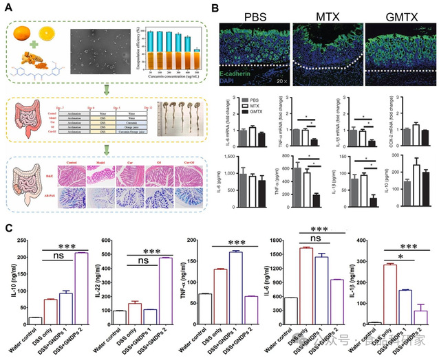 (A)柑橘来源的细胞外囊泡作为天然生物活性纳米载体,制备具有缓解结肠炎特性的姜黄素强化橙汁的示意图(Liu et al., 2024);(B)GMTX 在急性结肠炎中的疗效(Wang, Zhou, et al., 2014)(C)采用酶联免疫吸附法测定结肠组织中炎症介质的浓度(Zhang et al., 2016)