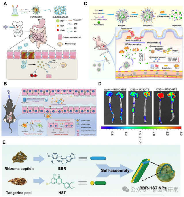 (A)通过高能乳化法制备姜黄素 / 大黄素纳米乳(CUR/EMO NE),并经物理交联构建海藻酸钠(Alg)水凝胶包覆制剂(CUR/EMO NE@SA)的示意图,及其通过协同抗炎和促进肠黏膜修复治疗 IBD 的作用机制(Lei et al., 2023);(B)Kae/CMCHD@RNs 的结肠靶向特性及体内抗 UC 治疗示意图(Tang et al., 2025);(C)活性氧(ROS)响应型纳米载体改善小鼠结肠炎的示意图(Yan, Regenstein, et al., 2023);(D)TB 和 HTB 在体内的黏附效果(Chen, Hao, et al., 2022);(E)小檗碱(BBR)与橙皮素(HST)通过自组装形成无载体、多功能球形纳米颗粒(BBR-HST NPs)的示意图(Gao et al., 2023)
