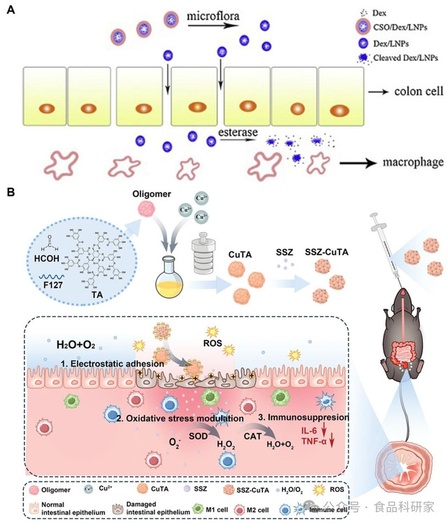 (A)Qu-SS-Gcc LNPs 纳米平台用于溃疡性结肠炎(UC)的靶向响应性药物递送机制示意图(Chen et al., 2020);(B)SSZ-CuTA 的合成及其体内治疗 IBD 的作用示意图(Yan et al., 2024)