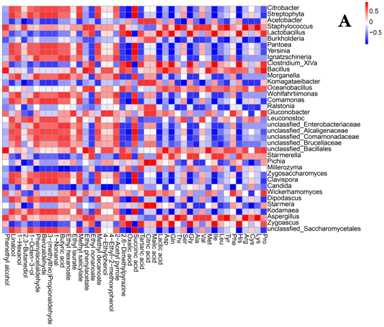 Fig.5. Correlations between flavors and representative microbial genera in the FG(A), CTF (B) and TF (C) and quantities of flavors related to microbial genera(D).