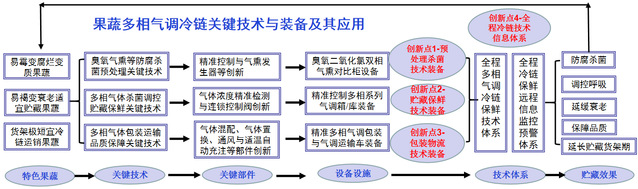 该成果重点针对果蔬采后腐烂损失严重与装备缺乏等瓶颈问题,以西南特色果蔬为对象,系统研究了特色果蔬的采后生理病理规律与特点,开发了多相气调保鲜工艺技术及关键装备,创建了特色果蔬多相气调协同组合保鲜链与远程信息监控预警体系,为多种果蔬多相气调协同保鲜提供了新路径。并研发了用于气调箱/库的外接气体浓度检测装置与连锁式气液电动控制阀,以及用于气调包装机的气体混配、均匀送气、气体置换等装置与内切及调节结构,创制了用于气调运输车的液氮充注气调与变风量通风及换气装置;基于关键部件设计,融合臭氧二氧化氯双相气熏,协同精准检测与配气、正压置换、液氮充注等技术,研创了双相气熏柜、精准调控气调箱/库、正压气调包装机与气调运输车等系列新装备,并实现了远程监控,提升了特色果蔬的保鲜效果。
