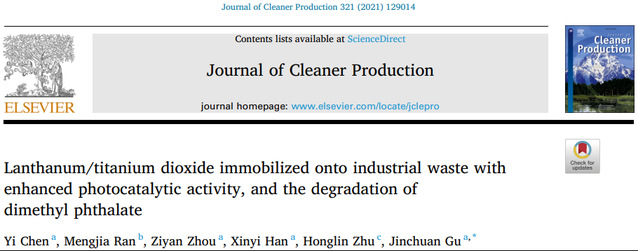 bv伟德国际体育官方网站谷晋川教授环境污染治理研究团队,一直致力于环境污染治理、环境材料、废弃物资源化和难处理废水催化氧化技术研究,近期以谷晋川教授为通讯作者,陈怡博士为第一作者在Journal of Cleaner Production(一区,IF2021=9.297)上发表题为“Lanthanum/titanium dioxide immobilized onto industrial waste withenhanced photocatalytic activity, and the degradation ofdimethyl phthalate”的研究论文。
