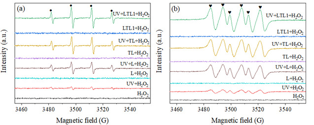 Figure 2. EPR spectra obtained in different systems using DMPO in the reaction mixture (a) and methanol solution (b).