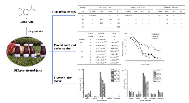 (2)添加了2g/L GA的复合蓝莓汁在超高压、超声波、热处理(HT)后货架期分别达到72、48和88天。经三种处理的果汁混合物中的总花青素、抗坏血酸和总酚含量在处理后或前16天储存期间没有立即变化。然而16天后,混合果汁中总花青素、抗坏血酸和总酚含量依次下降,下降速率为US>HPP>HT。HPP和US处理的果汁在风味方面优于HT处理的果汁,并且在保存更多类型和相对含量的酯和醛方面。总之,GA改善了果汁中的总ACs和抗坏血酸稳定性,而HPP和US处理的果汁的风味超过了HT处理的果汁。因此,在16天的储存时间内,HPP处理的果汁更具营养优势,具有最大的市场潜力,而在长期储存方面,HT处理的果汁被认为更安全、更稳定。