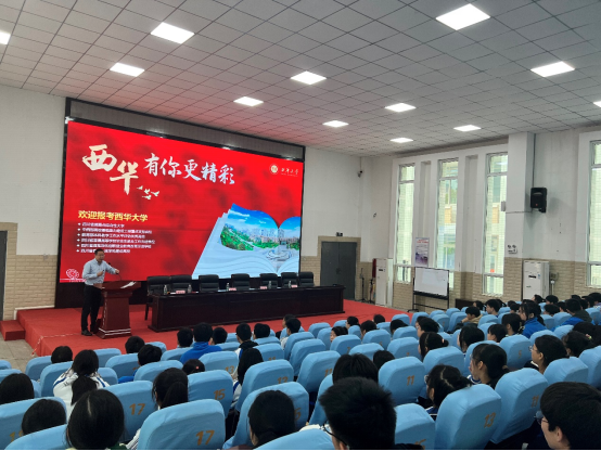 在两所中学的安排下,熊华、张广峰、马嫄分别在两校大礼堂面向部分高二、高三学生进行了招生宣讲,先给学生直观的播放了学校及学院的宣传视频,然后详细讲解了西华大学的办学历程、办学特色,师资情况,学生学习、生活、运动的硬件设施,学科特点及优势,就业情况以及2023年招生情况。并向学生从专业角度介绍了bv伟德国际体育官方网站几个招生专业的专业知识,台下同学听得专注认真,并时不时记下笔记。表示为西华大学的办学硬件、师资情况、专业特色所吸引,希望今后可以考入西华大学,成为一名优秀的西华学子。