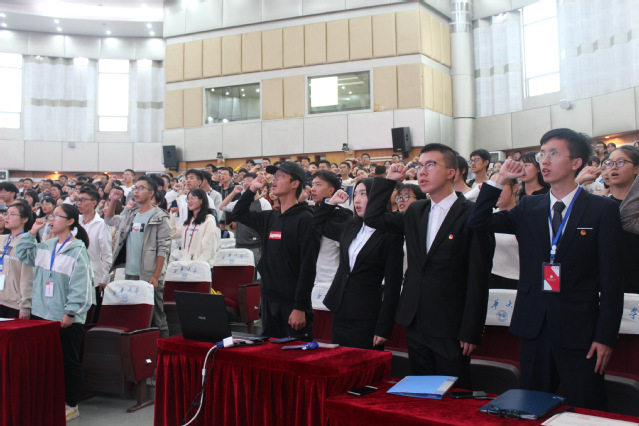 第十七届学生会主席张耀龙上台对未来一年做出展望,表达了对团委学生会工作的积极态度、对干部和干事的要求,力求把学院团委学生会打造成一个一流的、完美的团体。随后,新生干事庄皓宇发言。他谈到,在今后的工作中定不负学院的期望,努力做好自己的本职工作,撸起袖子加油干。全体团委学生会成员在李明帅老师的带领下庄严宣誓。
