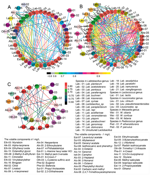 Fig.5.The co-occurrence patterns (r>0.6 and r<– 0.6) between volatile compounds and LABs.