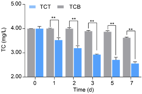 Fig. 1. The concentrationof TC residue in TCT and sterilized aged salt brine(TCB).